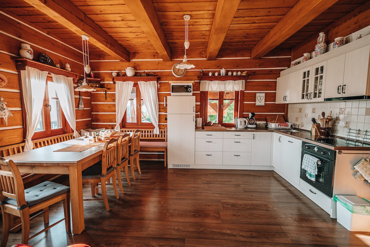 - kuchyně: varná deska, horkovzdušná trouba, myčka, vestavná lednička, mikrovlnná trouba, jídelní kout s rohovou lavicí, kávovar, toustovač