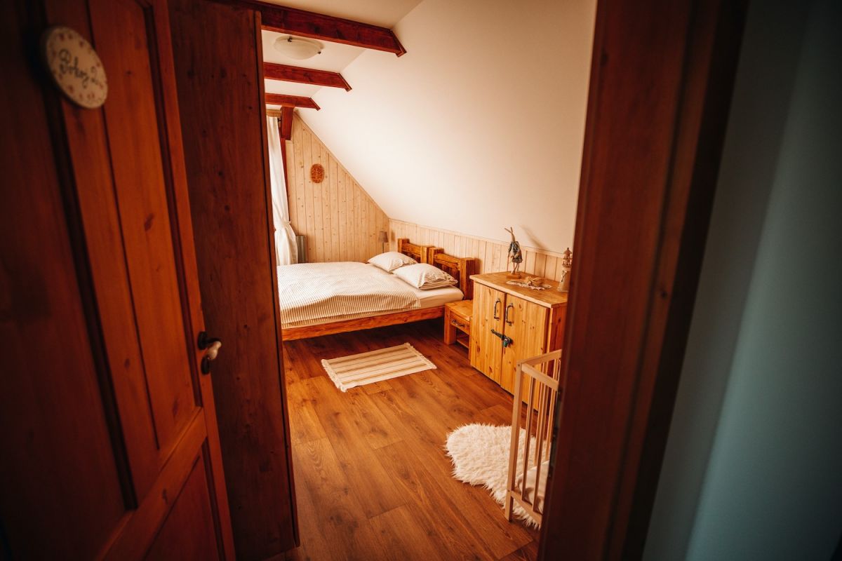 - pokoje: dřevěné postele, dětská dřevěná postýlka, skříně a komody, koupelna – vana, sprchový kout, ručníky, přebalovací pult