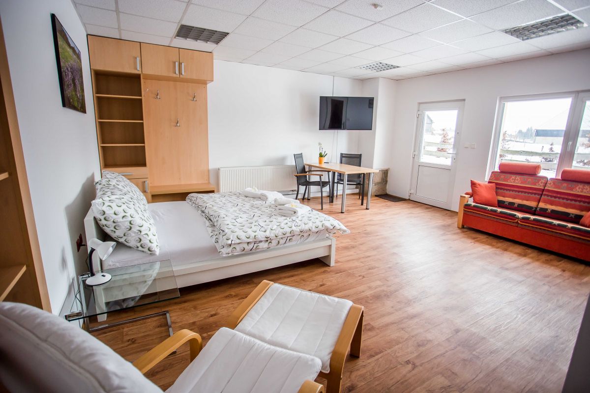 K dispozici je apartmán pro 2 osoby s dvoulůžkovou postelí, vybavený kuchyňkou linkou s lednicí, vlastní koupelnou a záchodem, TV ,Wi-fi