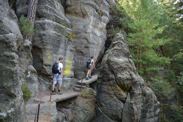 Kyjov, malou vesničku s roubenkami najdete hned vedle Krásné Lípy. Z parkoviště se vydáte po červené, kolem Dixova mlýna dál po proudu říčky Křinice až k odbočce na strmé dřevěné stupně. Skalní rozsedlinou lze po nich vyšplhat na Kinského vyhlídku. Mezi vrcholky stromů můžete vidět na protější vrcholky skal nad údolím. Odsud se vydáme po Kyjovské skalní stezce.Tato důmyslně vybudovaná trasa vede skalnatým terénem s množstvím schodů a žebříků, ale také výhledů na různé skalní útvary.