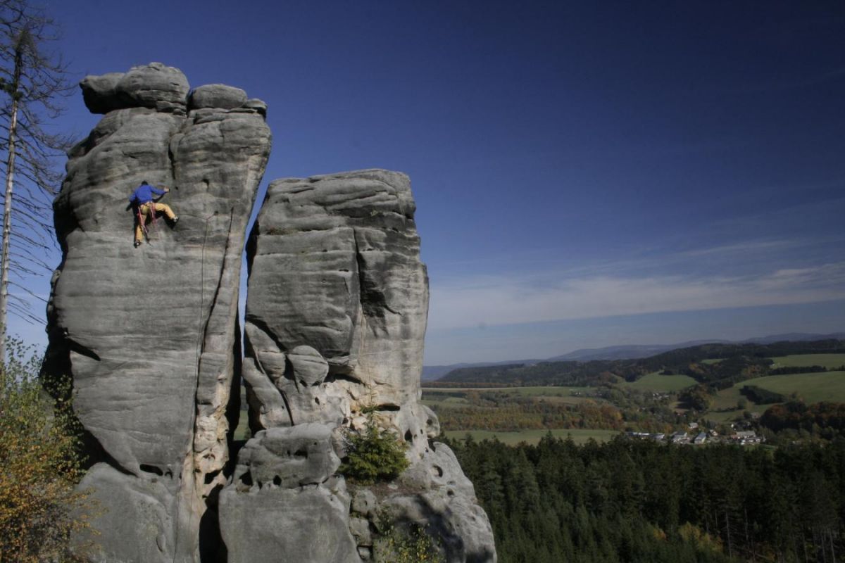 Klasická lezecká oblast Broumovska. Zatímco v Adršpašsko-teplických skalách už saští lezci vylezli řadu dominantních vrcholů mezi světovými válkami, zde se plně rozvinulo lezení až v roce 1944 zásluhou náchodských a polických lezců. Ostaš je rozdělen do tří částí. První dvě části, Horní a Dolní labyrint, tvoří věže a okrajové stěny (přes 260 lezeckých cílů s tisícovkou výstupů), další částí je boulderingová oblast, kde je popsáno kolem 130 kamenů a 600 boulderů. Na Ostaši najdete prakticky všechny druhy lezení, pískovec je tu hrubozrnný a v drtivé většině stěn pevný. V poslední době tu opět hnízdí sokol stěhovavý a proto se s aktuálním omezením lezení předem seznmte.