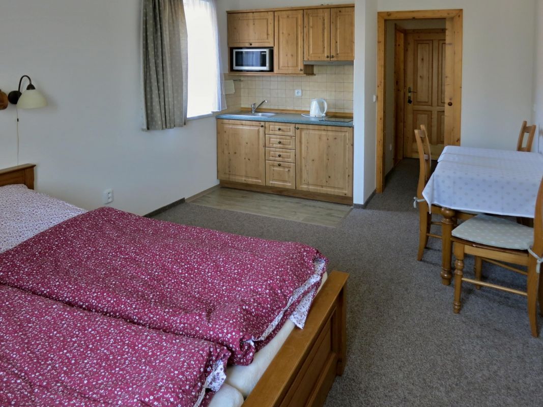 Dvoulůžkové pokoje a dvoupokojové apartmány s vlastním sociálním zařízením a kuchyňkou.