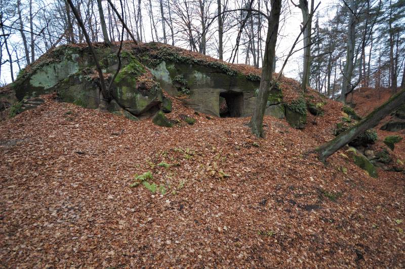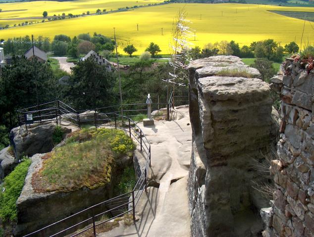 Sejdeme zpět na silnici a pokračujeme na samý okraj Příhrazských skal, k restauraci Na Krásné vyhlídce. Zde je nejenom možnost občerstvení, ale naskýtá se nám další krásný výhled na severní a východní Čechy. Od restaurace se kousek vrátíme, směrem odkud jsme přišli a odbočíme doleva na modrou značku. Cesta vede stále lesem až na rozcestí, kde se kříží se žlutou značkou. My se držíme stále modré a asi po 500 m přijdeme k odbočce na zříceninu hradu Hynšta. Dostaneme se sem po skalnatém hřebínku, značeném modrou turistickou značkou. Hrad byl vytesaný do jednoho skalního bloku, zbytek dostavěli ze dřeva. V 17. století se zde ukrývali stoupenci bratrské víry. Z hradu uvidíte už jen jednu větší vytesanou světničku se středním pilířem, která je přístupná dlouhou vstupní chodbou. Po návratu na hlavní cestu pokračujeme lesem stále po modré značce až k silnici. Po silnici sejdeme přes osadu Zásadka až k parkovišti pod Valečovem.